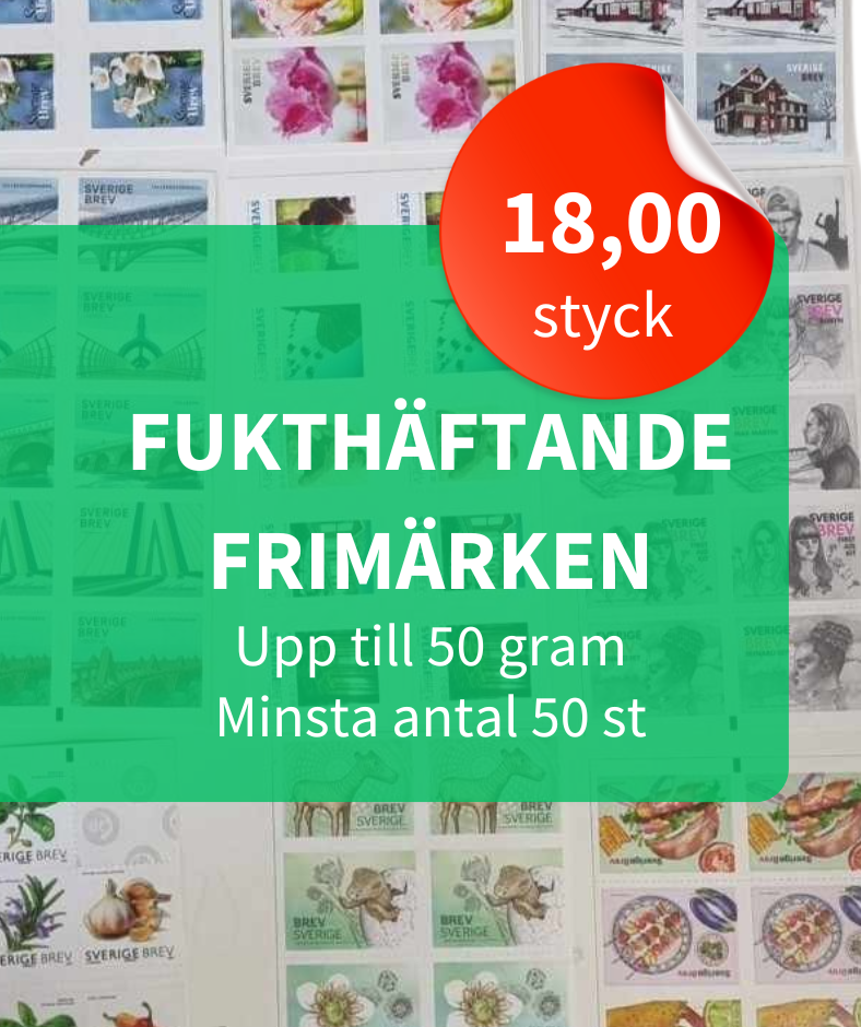 Fukthäftande frimärken som du fuktar för att aktivera limmet på dess baksida kostar normalt 22 kr. Hos oss betalar du endast 18,00